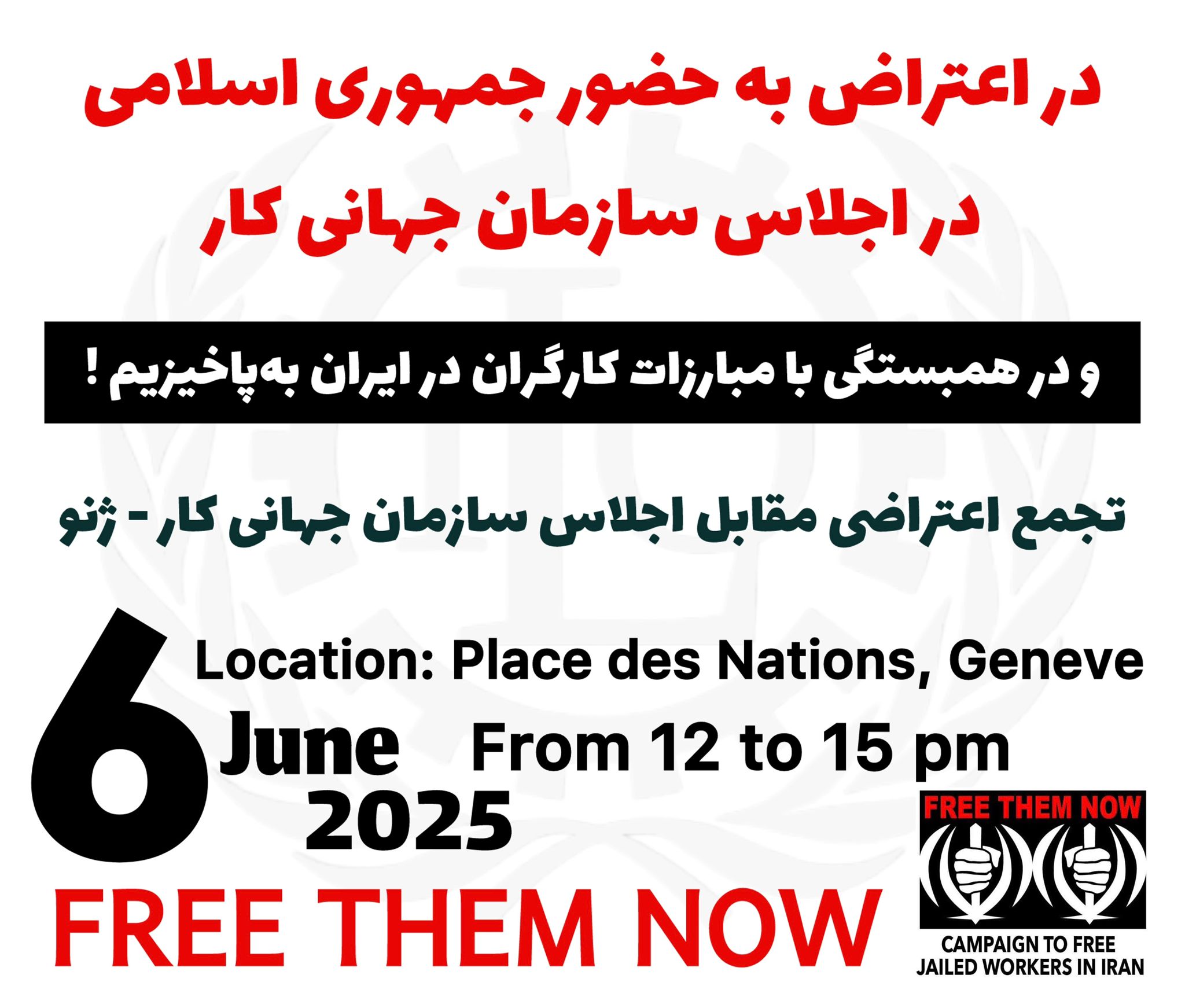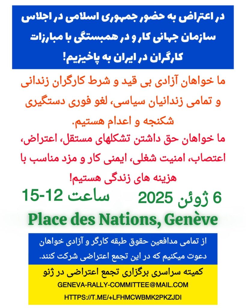 “کمیته سراسری برگزاری تجمع اعتراضی در ژنو” دراعتراض به حضور جمهوری اسلامی در اجلاس سازمان جهانی کار و در همبستگی با مبارزات کارگران در ایران برای روز جمعه ششم ژوئن ۲۰۲۵ به برگزاری آکسیونی فراخوان داده است. این میتینگ اعتراضی در ساعت دوازده تا سه بعد از ظهر در میدان ملل مقابل اجلاس سازمان جهانی کار در ژنو در کشور سوئیس برگزار خواهد شد.