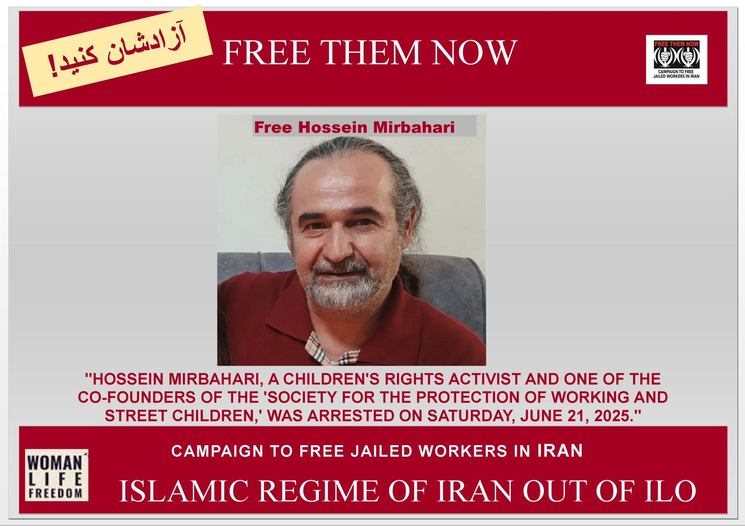کمپین برای آزادی کارگران زندانی از همه نهادهای کارگری، مدافع حقوق کودک و نهادهای انساندوست درخواست دارد که با اعلام انزجار خود از این دستگیریها و اعلام حمایت از  حسین میربهاری بر آزادی فوری و بدون قید  و شرط این فعال مدافع حقوق کودکان کار و خیابان و تمامی زندانیان سیاسی تاکید کنند.