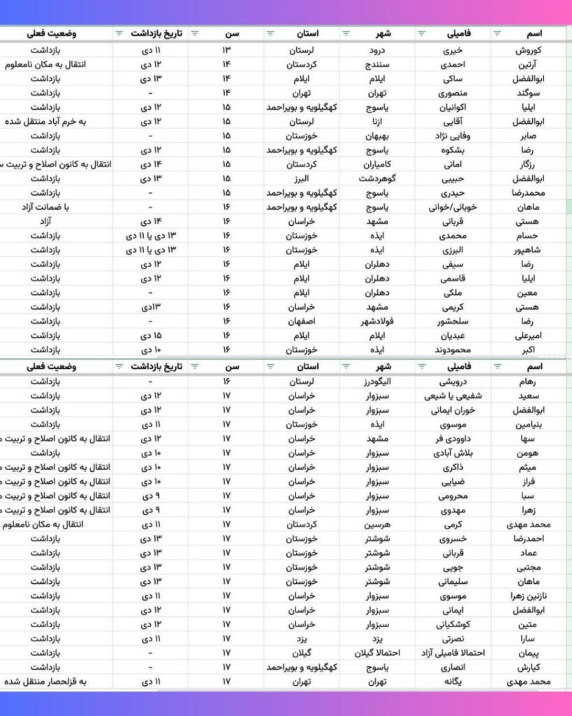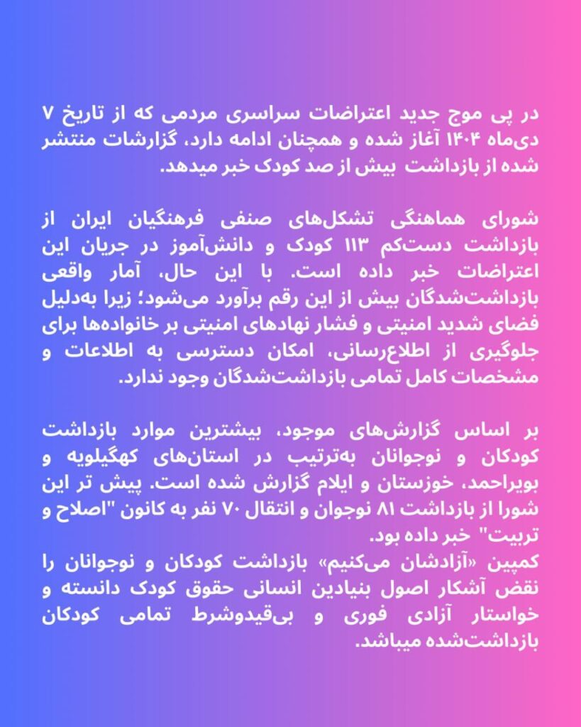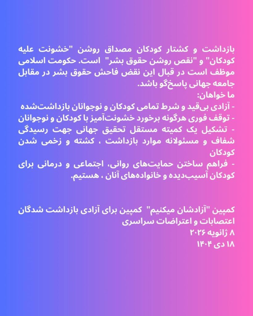 اخبار کارگران زندانی اطلاعیه شماره ۲ کمپین آزادشان کنید: کودکان بازداشتی را فورا و بدون قید و شرط آزاد کنید by admin_shahla 09/01/2026 written by admin_shahla 09/01/2026 74 برای اشتراکگذاشتن فیسبوک خود کلیک کنید (در پنجرۀ تازه باز میشود)برای به اشتراک گذاشتن در توییتر کلیک کنید (در پنجرۀ تازه باز میشود)برای به اشتراک گذاشتن روی لینکداین کلیک کنید (در پنجرۀ تازه باز میشود) 0 comment 0 FacebookTwitterPinterestEmail پست قبلی آزادشان میکنیم!آغاز کمپین برای آزادی بازداشتشدگان اعتصابات و اعتراضات سراسری پست بعدی کارگران و مردم ایران به حمایت جهانی نیاز فوری دارند. خبر های دیگر دستگیر شدگان دیماه باید فورا و بدون قید... 05/02/2026 هشتاد و چهار سازمان حقوق بشری بیانیه مشترکی... 16/12/2025 سیسل کولر و ژاک پاری، فعالین اتحادیه معلمان... 05/11/2025 گفتگو با محمد شاندیز فرزند مهدی فراحی شاندیز... 29/10/2025 تشدید دستگیری فعالین کارگری – اجتماعی در ایران 22/10/2025 حسین میربهاری فعال برجسته کودکان کار و خیابان... 22/10/2025 پتی شن در حمایت از شریفه محمدی را... 21/08/2025 کارزاری جهانی در اعتراض به حکم اعدام شریفه... 21/08/2025 بیانیه جمعی از زندانیان سیاسی در محکومیت یورش... 18/08/2025 اخباری از دستگیری ها و وضعیت فعالین دربند 18/08/2025