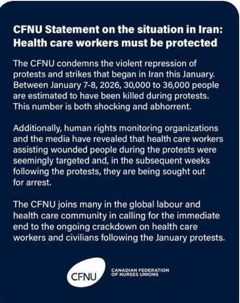 The Canadian Federation of Nurses Unions (CFNU) issued a statement condemning the criminal repression carried out by the Islamic Republic in Iran during the Dey protests. The federation described the mass killing of thousands of people in this brutal crackdown as abhorrent. Referring to the killing of healthcare workers who were assisting the injured during the popular protests, and the arrest of a number of them in the following weeks, the union declared its support and solidarity and called for an end to these criminal acts of repression. The English and Persian texts of this solidarity statement are attached.